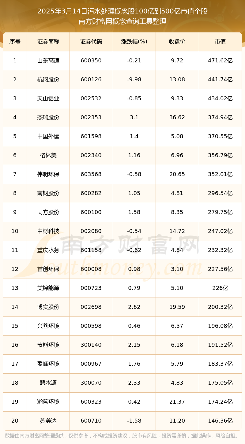 截止2025年3月14日,污水处理概念股市值100亿到500亿的个股共有40只。其中,市值较高的有山东高速、杭钢股份、天山铝业,市值分别为471.62亿元、441.74亿元、434.02亿元。