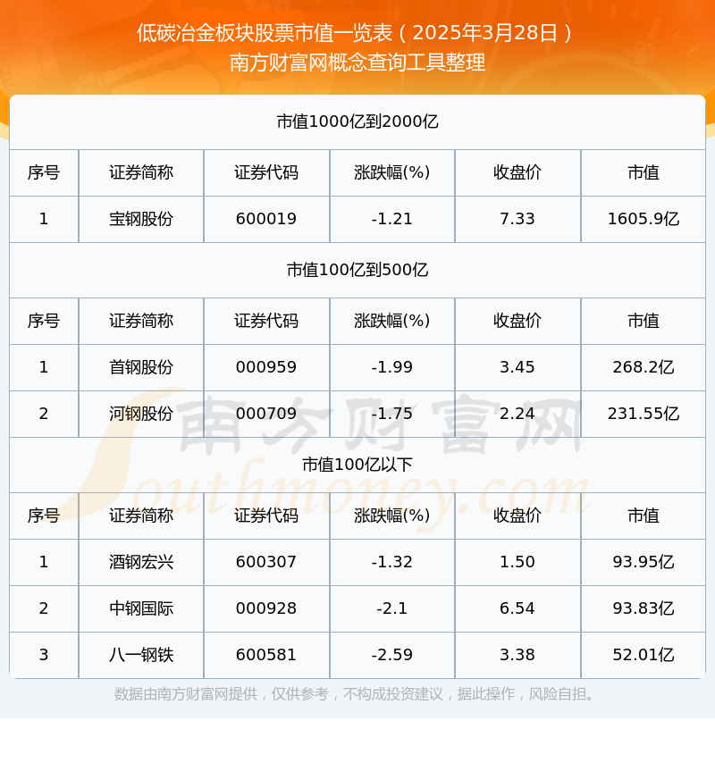 截止2025年3月28日,低碳冶金板块股票中酒钢宏兴、中钢国际、八一钢铁等3家市值位于不足100亿之列;首钢股份和河钢股份市值位于100亿到500亿之列;宝钢股份市值位于1000亿到2000亿之列。