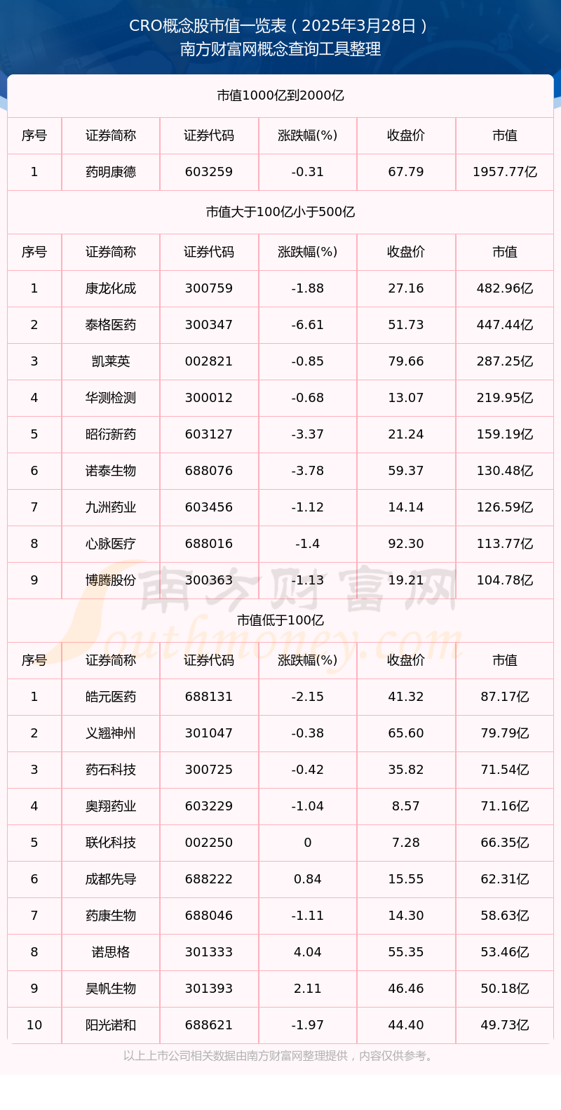 截止2025年3月28日,CRO概念股中皓元医药、义翘神州、药石科技、奥翔药业等30家市值位于不足100亿之列;康龙化成、泰格医药、凯莱英、华测检测、昭衍新药等9家市值位于100亿到500亿之列;药明康德市值位于1000亿到2000亿之列。