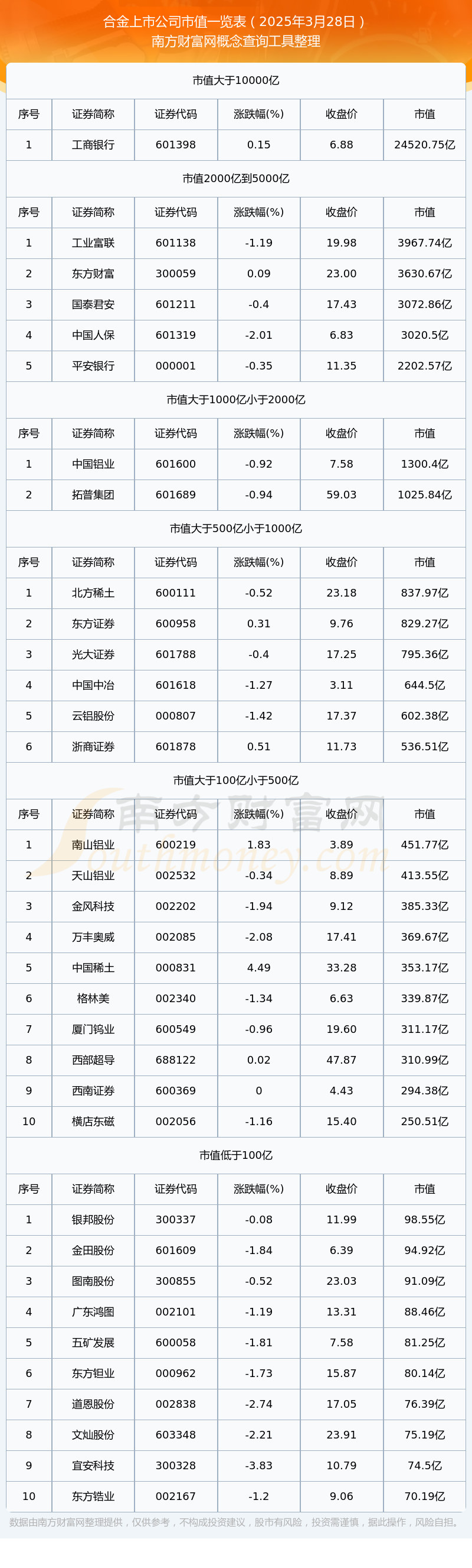 截止2025年3月28日,合金上市公司中银邦股份、金田股份、图南股份、广东鸿图等41家市值位于不足100亿之列;南山铝业、天山铝业、金风科技等26家市值位于100亿到500亿之列;北方稀土、东方证券、光大证券、中国中冶、云铝股份等6家市值位于500亿到1000亿之列;中国铝业和拓普集团市值位于1000亿到2000亿之列;工业富联、东方财富、国泰君安、中国人保、平安银行等5家市值位于2000亿到5000亿之列;工商银行市值位于大于10000亿之列。