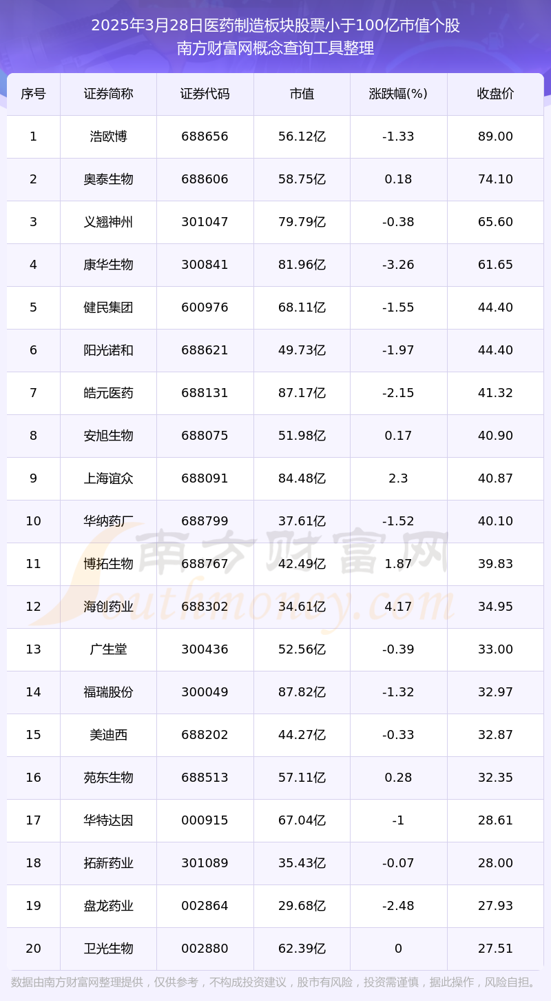 截止2025年3月28日,医药制造板块股票市值小于100亿的个股共有182只。其中,市值较高的有迪安诊断、诺唯赞、众生药业,市值分别为99.25亿元、96.93亿元、95.37亿元。