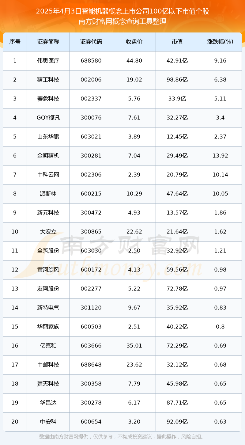 截止2025年4月3日,智能机器概念上市公司市值100亿以下的个股共有165只。其中,市值较高的有弘元绿能、精工科技、天准科技,市值分别为99.34亿元、98.86亿元、97.11亿元。