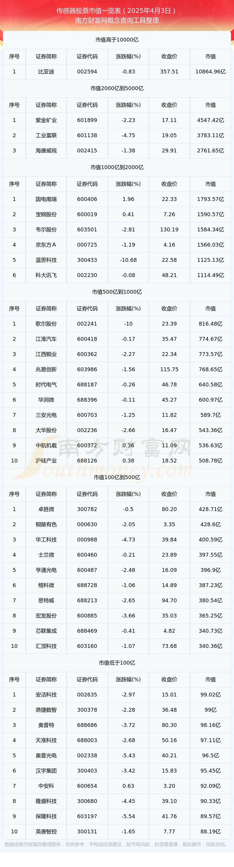 截止2025年4月3日,传感器股票中中微半导、蓝特光学、中安科、保隆科技、天准科技等56家市值位于不足100亿之列;中航机载、沪硅产业、铜陵有色、华工科技、士兰微等32家市值位于100亿到500亿之列;江淮汽车、江西铜业、兆易创新等6家市值位于500亿到1000亿之列;国电南瑞、宝钢股份、韦尔股份等4家市值位于1000亿到2000亿之列;紫金矿业和工业富联市值位于2000亿到5000亿之列。