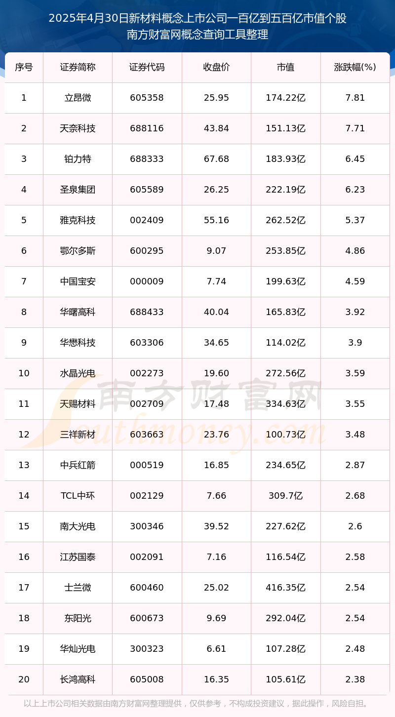 截止2025年4月30日,新材料概念上市公司市值一百亿到五百亿的个股共有150只。其中,市值较高的有沪硅产业、中天科技、北新建材,市值分别为478.83亿元、474.74亿元、473.4亿元。