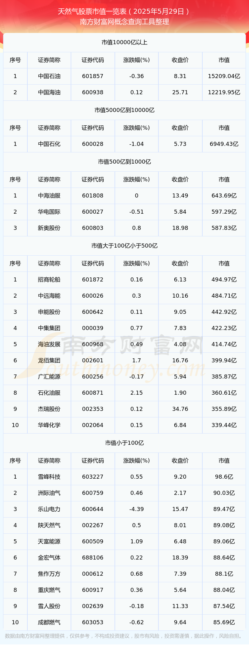 截止2025年5月29日,天然气板块股票中中工国际、雪峰科技、洲际油气、金宏气体等52家市值位于不足100亿之列;招商轮船、中远海能、申能股份、海油发展等39家市值位于100亿到500亿之列;中海油服、华电国际、新奥股份等3家市值位于500亿到1000亿之列;中国石化市值位于5000亿到10000亿之列;中国石油和中国海油市值位于大于10000亿之列。