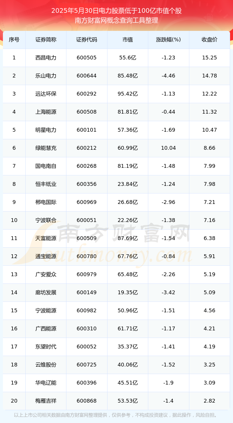截止2025年5月30日,电力股票市值低于100亿的个股共有22只。其中,市值较高的有远达环保、天富能源、乐山电力,市值分别为95.42亿元、87.69亿元、85.48亿元。