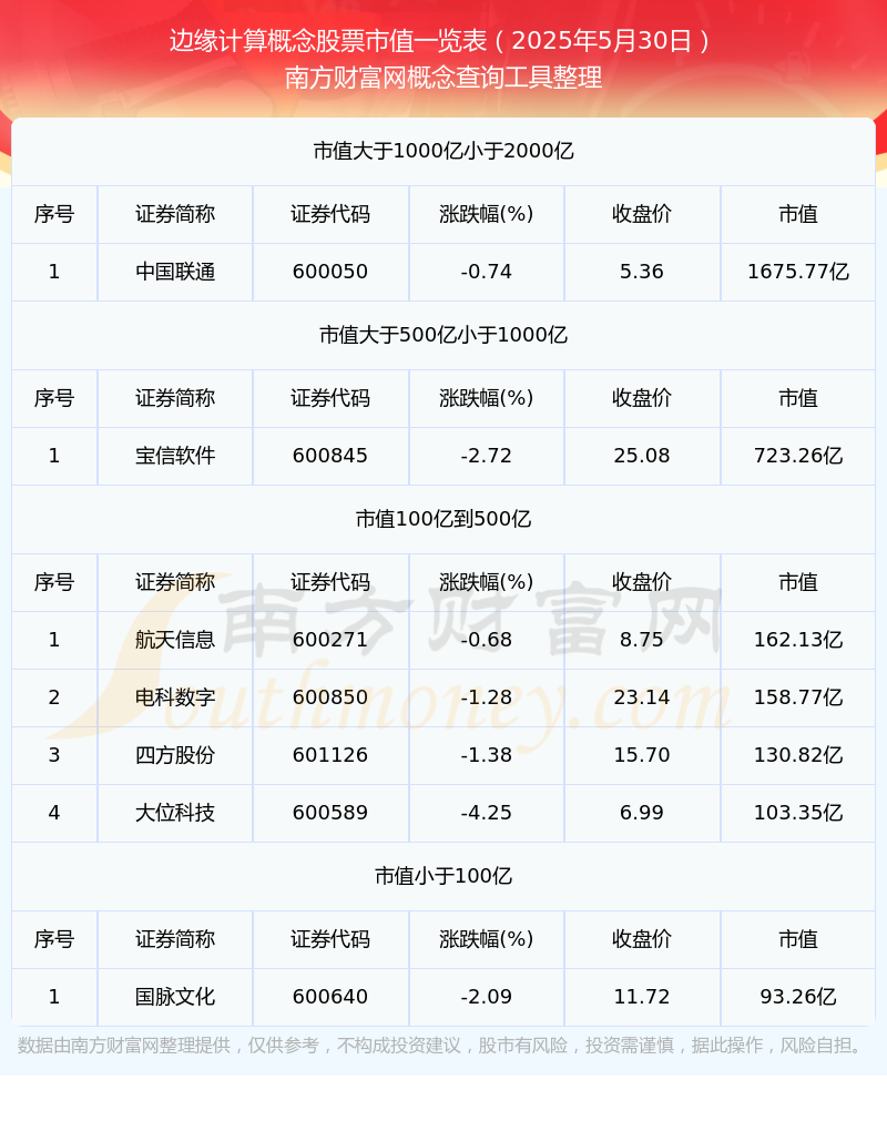 截止2025年5月30日,边缘计算概念股票中剑桥科技、天准科技、国脉文化、优刻得等49家市值位于不足100亿之列;恒玄科技、四川长虹、拓维信息等36家市值位于100亿到500亿之列;中科曙光、传音控股、宝信软件、浪潮信息等6家市值位于500亿到1000亿之列;中国联通和中兴通讯市值位于1000亿到2000亿之列;海光信息、海康威视、寒武纪等3家市值位于2000亿到5000亿之列;中国电信市值位于5000亿到10000亿之列;中国移动市值位于大于10000亿之列。
