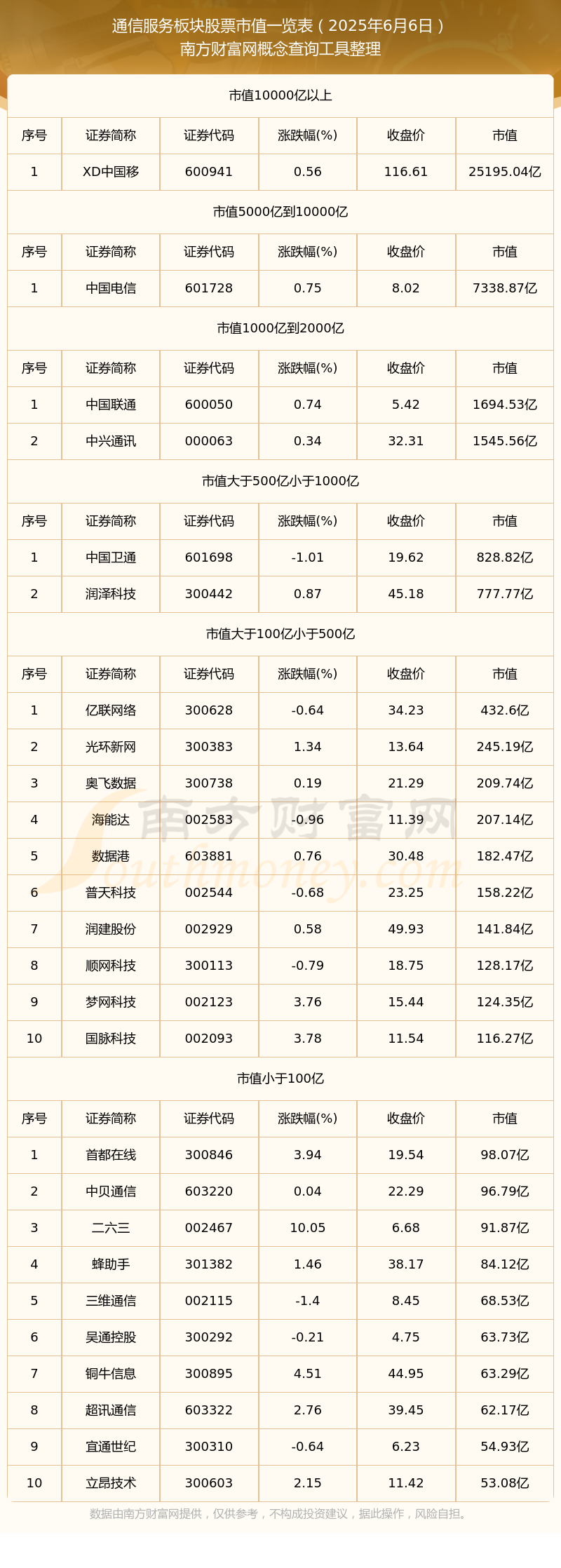 截止2025年6月6日,通信服务板块股票中首都在线、中贝通信、二六三等31家市值位于不足100亿之列;亿联网络、光环新网、奥飞数据、海能达等11家市值位于100亿到500亿之列;中国卫通和润泽科技市值位于500亿到1000亿之列;中国联通和中兴通讯市值位于1000亿到2000亿之列;中国电信市值位于5000亿到10000亿之列;XD中国移市值位于大于10000亿之列。