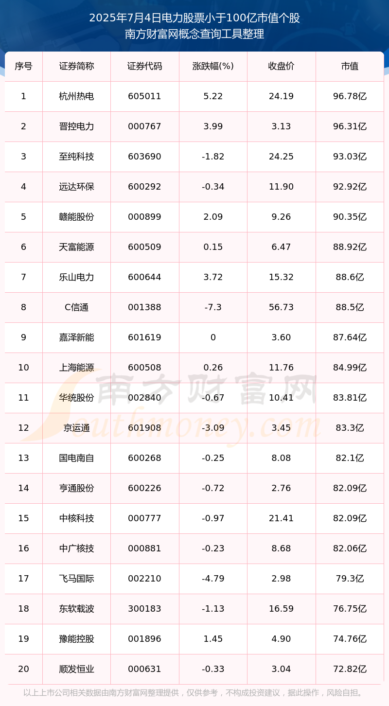 截止2025年7月4日,电力股票市值小于100亿的个股共有93只。其中,市值较高的有杭州热电、晋控电力、至纯科技,市值分别为96.78亿元、96.31亿元、93.03亿元。
