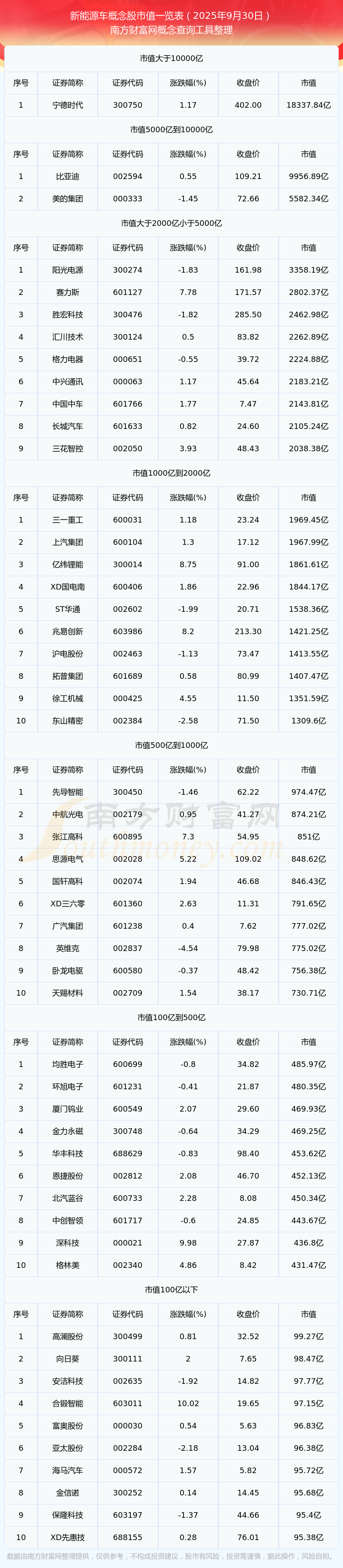 截止2025年9月30日,新能源车概念股中动力新科、国机汽车、同济科技、广日股份、金龙汽车等50家市值位于不足100亿之列;均胜电子、环旭电子、厦门钨业、北汽蓝谷、宏发股份等34家市值位于100亿到500亿之列;张江高科、XD三六零、广汽集团、卧龙电驱、东方电气等11家市值位于500亿到1000亿之列;三一重工、上汽集团、XD国电南、江淮汽车等4家市值位于1000亿到2000亿之列;赛力斯市值位于2000亿到5000亿之列。