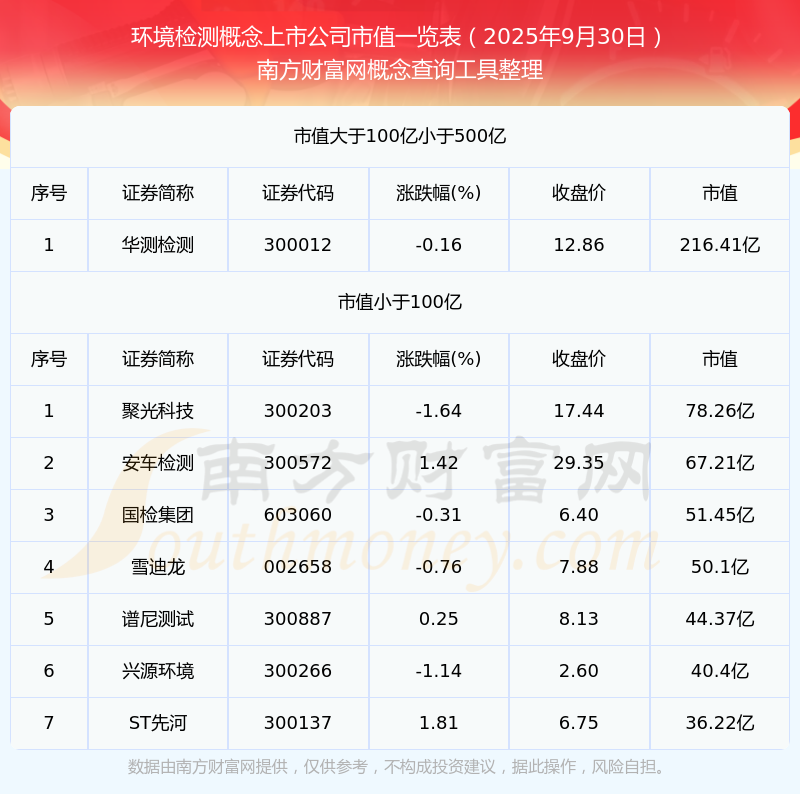截止2025年9月30日,环境检测概念上市公司中聚光科技、安车检测、国检集团、雪迪龙等7家市值位于不足100亿之列;华测检测市值位于100亿到500亿之列。