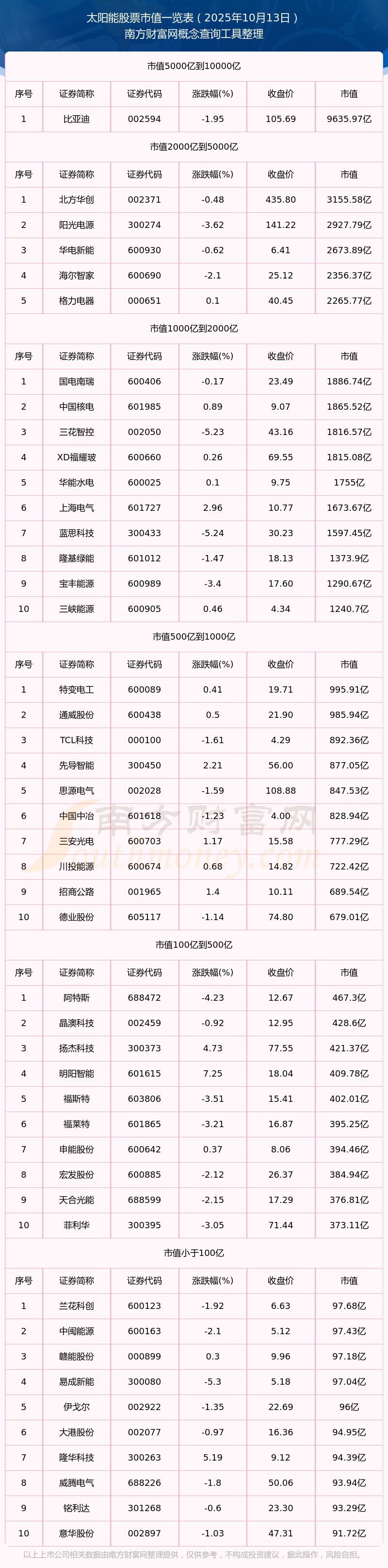 截止2025年10月13日,太阳能股票中兰花科创、中闽能源、华电科工、福日电子、宝胜股份等40家市值位于不足100亿之列;明阳智能、申能股份、宏发股份、新天绿能、爱旭股份等40家市值位于100亿到500亿之列;特变电工、通威股份、中国中冶、三安光电等9家市值位于500亿到1000亿之列;国电南瑞、XD福耀玻、华能水电等9家市值位于1000亿到2000亿之列;华电新能和海尔智家市值位于2000亿到5000亿之列。