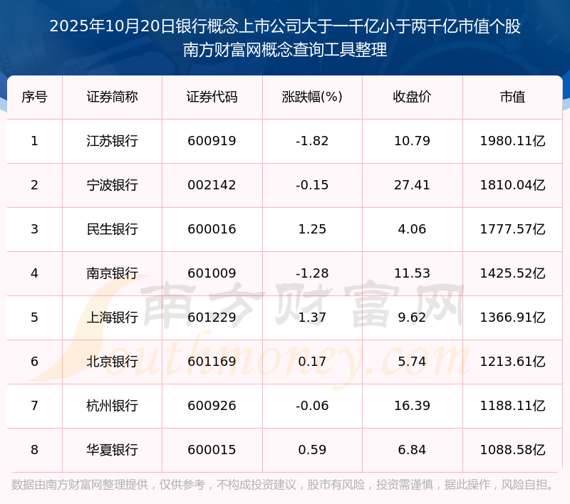 截止2025年10月20日,银行概念上市公司市值大于一千亿小于两千亿的个股共有8只。其中,市值较高的有江苏银行、宁波银行、民生银行,市值分别为1980.11亿元、1810.04亿元、1777.57亿元。