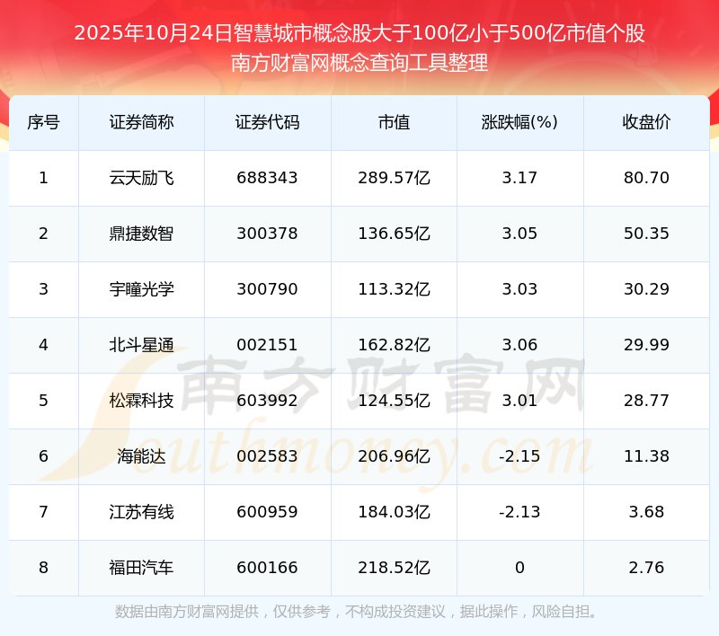 截止2025年10月24日,智慧城市概念股市值大于100亿小于500亿的个股共有8只。其中,市值较高的有云天励飞、福田汽车、海能达,市值分别为289.57亿元、218.52亿元、206.96亿元。