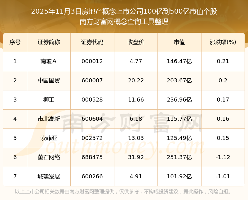 截止2025年11月3日,房地产概念上市公司市值100亿到500亿的个股共有7只。其中,市值较高的有萤石网络、柳工、中国国贸,市值分别为251.37亿元、236.96亿元、203.67亿元。