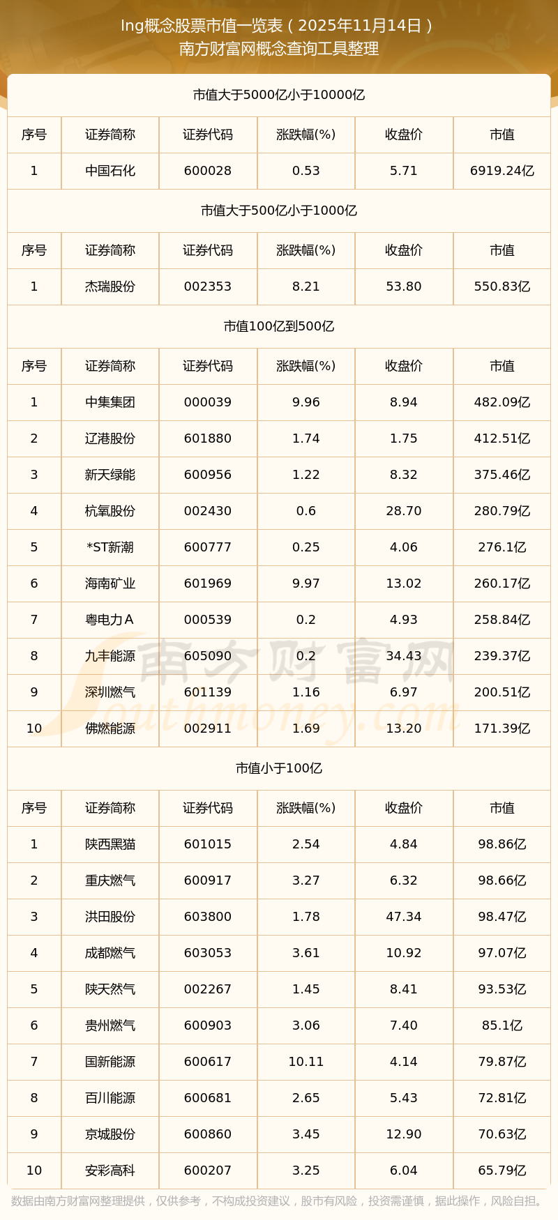 截止2025年11月14日,lng概念股票中重庆燃气、成都燃气、洪田股份、陕西黑猫、陕天然气等45家市值位于不足100亿之列;石化油服、中集集团、君正集团等42家市值位于100亿到500亿之列;招商轮船、中远海能、中海油服、新奥股份、杰瑞股份等5家市值位于500亿到1000亿之列;潍柴动力、上海电气、徐工机械等3家市值位于1000亿到2000亿之列;中国船舶市值位于2000亿到5000亿之列;中国石化市值位于5000亿到10000亿之列;中国石油和中国海油市值位于大于10000亿之列。