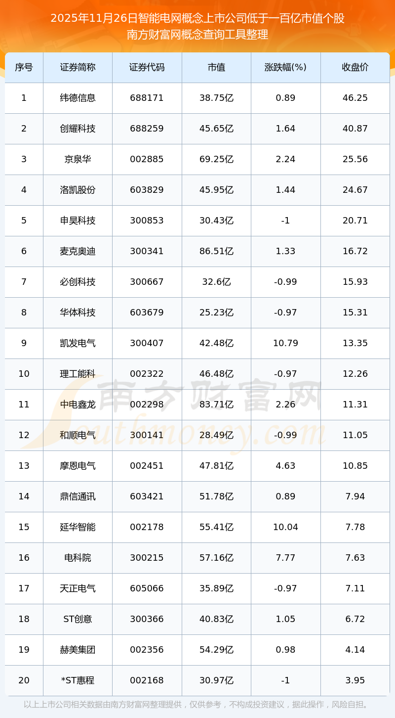 股价上看,截止2025年11月26日收盘,这些股票股价上涨的有15只,占比68.18%,其中,涨幅大于5%的股票有4只,涨幅较大的分别为ST合纵、凯发电气、延华智能,涨幅为12.9%、10.79%、10.04%,股价下跌的有7只,占比31.82%。