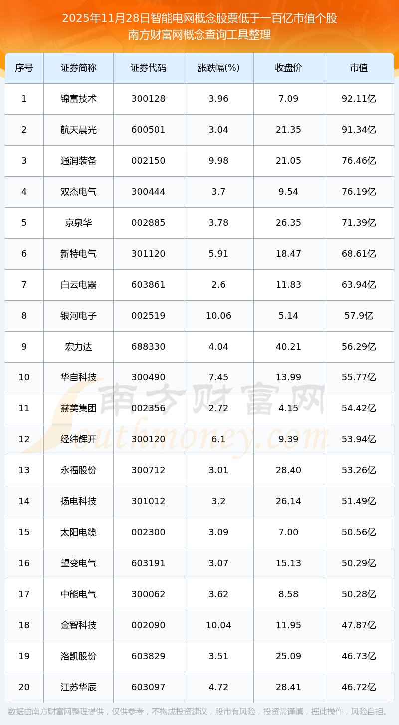截止2025年11月28日,智能电网概念股票市值低于一百亿的个股共有33只。其中,市值较高的有锦富技术、航天晨光、通润装备,市值分别为92.11亿元、91.34亿元、76.46亿元。
