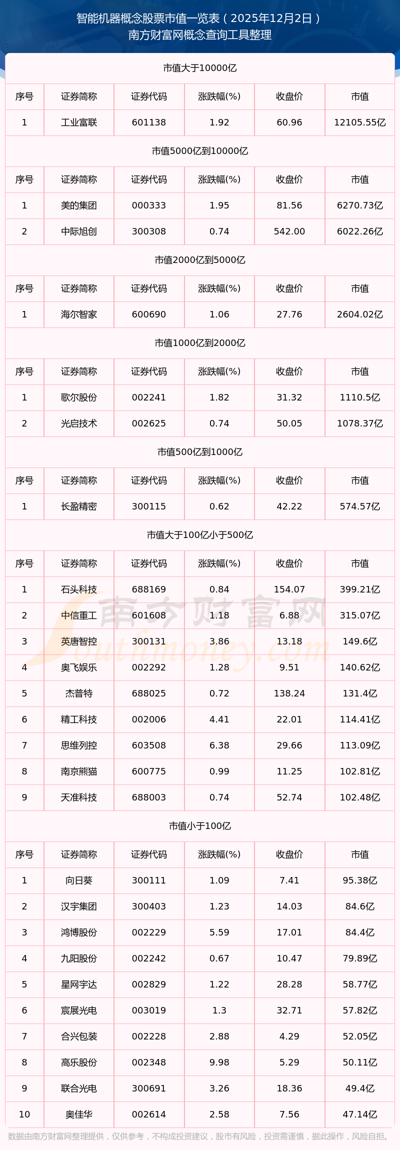 截止2025年12月2日,智能机器概念股票中恒为科技、黄河旋风、上海沪工等48家市值位于不足100亿之列;科沃斯、均胜电子、宏发股份、春风动力等41家市值位于100亿到500亿之列;华工科技、紫光股份、中天科技等3家市值位于500亿到1000亿之列;国电南瑞、恒立液压、恒力石化等3家市值位于1000亿到2000亿之列;海尔智家、格力电器、中兴通讯等3家市值位于2000亿到5000亿之列;美的集团市值位于5000亿到10000亿之列;工业富联市值位于大于10000亿之列。