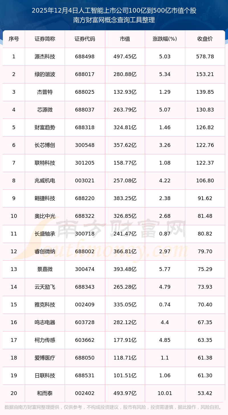 截止2025年12月4日,人工智能上市公司市值100亿到500亿的个股共有87只。其中,市值较高的有源杰科技、和而泰、中国长城,市值分别为497.45亿元、493.97亿元、469.68亿元。