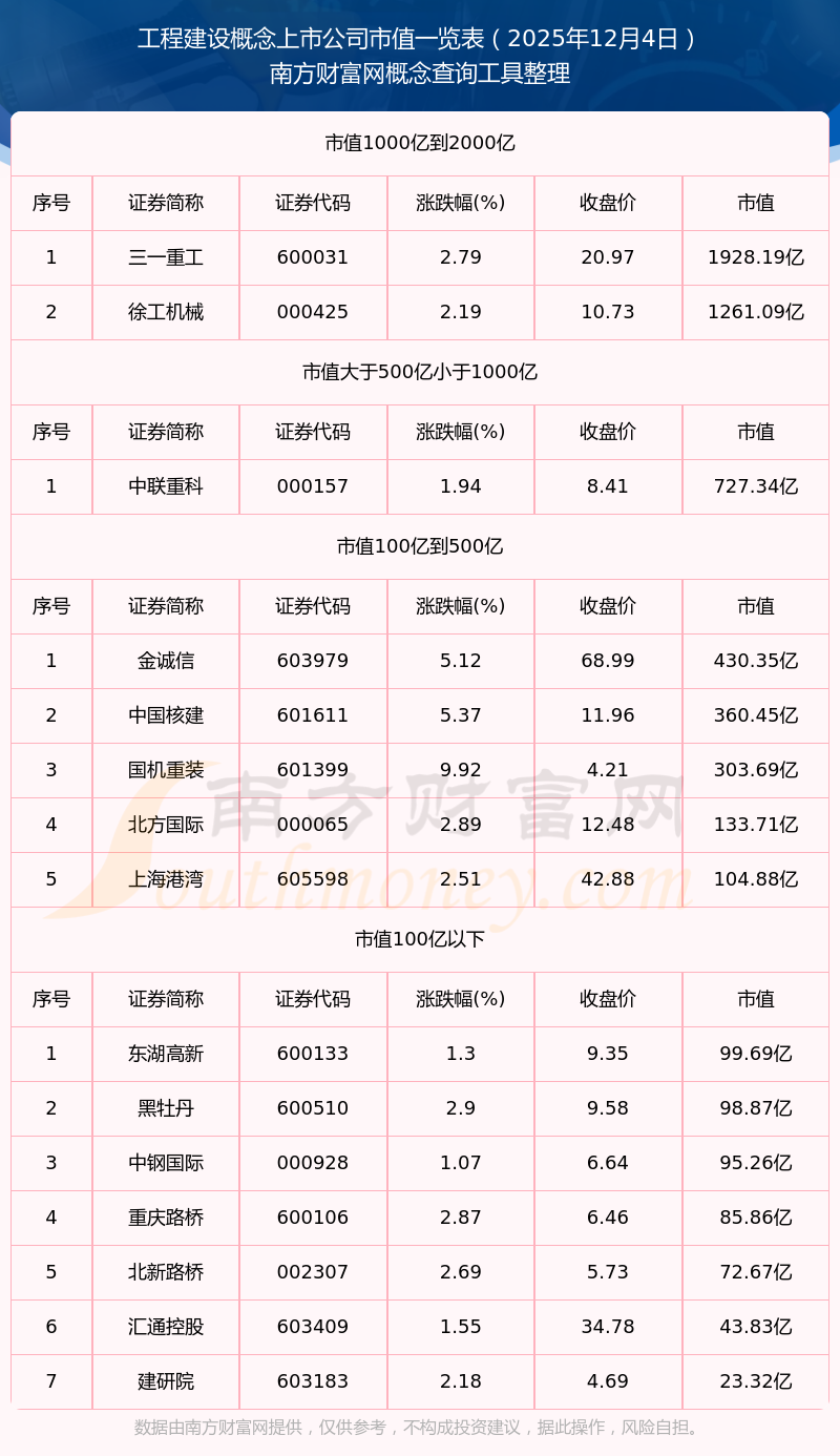 截止2025年12月4日,工程建设概念上市公司中东湖高新、黑牡丹、中钢国际、山东路桥等54家市值位于不足100亿之列;复旦微电、中国化学、石化油服、金诚信等32家市值位于100亿到500亿之列;中国能建、中国电建、四川路桥等5家市值位于500亿到1000亿之列;三一重工、中国核电、中国交建、中国中铁、徐工机械等7家市值位于1000亿到2000亿之列;中国建筑市值位于2000亿到5000亿之列。