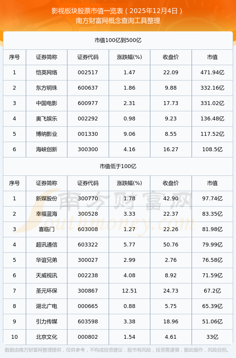 截止2025年12月4日,影视板块股票中文投控股、新媒股份、掌阅科技、中科金财、幸福蓝海等53家市值位于不足100亿之列;恺英网络、光线传媒、芒果超媒、岩山科技、东方明珠等28家市值位于100亿到500亿之列。