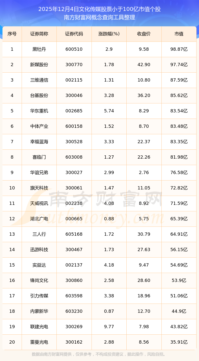 截止2025年12月4日,文化传媒股票市值小于100亿的个股共有22只。其中,市值较高的有黑牡丹、新媒股份、三维通信,市值分别为98.87亿元、97.74亿元、87.59亿元。