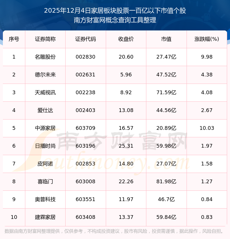 截止2025年12月4日,家居板块股票市值一百亿以下的个股共有10只。其中,市值较高的有喜临门、天威视讯、日播时尚,市值分别为81.98亿元、71.59亿元、59.98亿元。