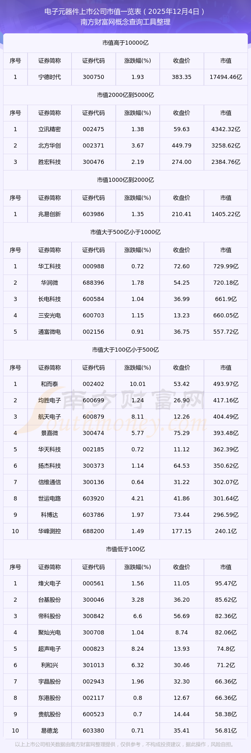 截止2025年12月4日,电子元器件上市公司中烽火电子、东方锆业、同洲电子等40家市值位于不足100亿之列;和而泰、环旭电子、闻泰科技等41家市值位于100亿到500亿之列;TCL科技、生益电子、华工科技等10家市值位于500亿到1000亿之列;京东方A、兆易创新、生益科技、沪电股份、东山精密等7家市值位于1000亿到2000亿之列;立讯精密和北方华创市值位于2000亿到5000亿之列。