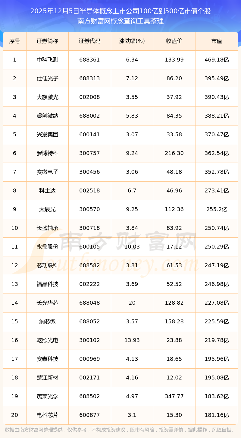 截止2025年12月5日,半导体概念上市公司市值100亿到500亿的个股共有45只。其中,市值较高的有中科飞测、仕佳光子、大族激光,市值分别为469.18亿元、395.49亿元、390.43亿元。