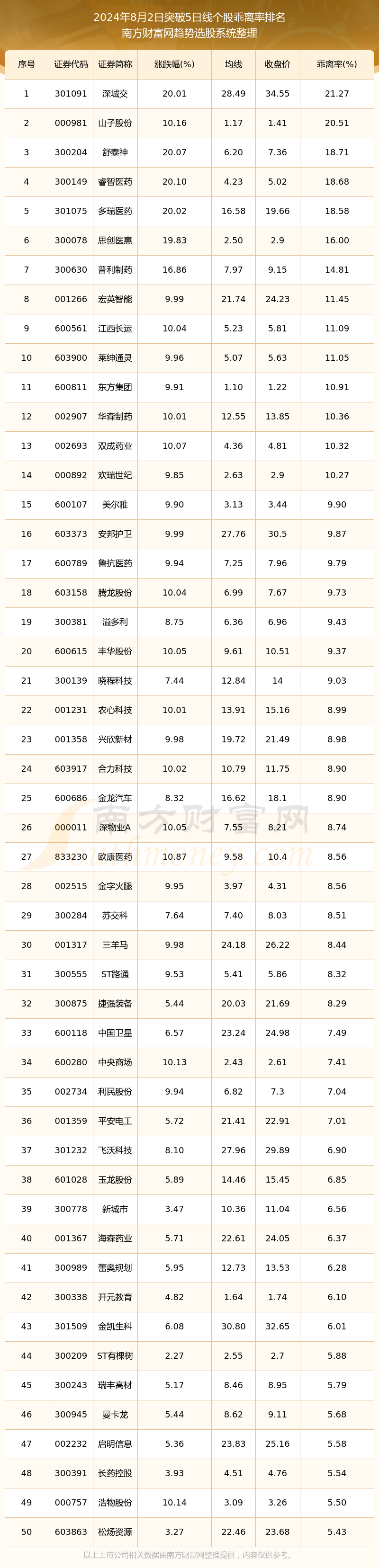 根据南方财富网趋势选股系统数据统计,截止2024年8月2日收盘,共有376只个股收盘价向上突破了5日线,其中乖离率较大的个股有深城交、山子股份、舒泰神、睿智医药、多瑞医药等,乖离率分别为21.27%、20.51%、18.71%、18.68%、18.58%。