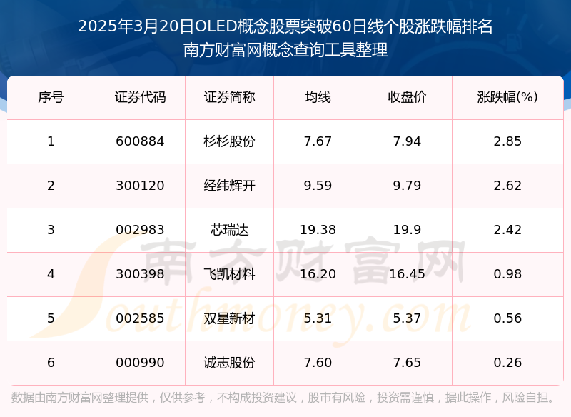 根据南方财富网概念查询工具数据统计,截止2025年3月20日收盘,OLED概念股票共有6只个股收盘价向上突破了60日线。其中涨幅较大的个股有杉杉股份、经纬辉开、芯瑞达等,涨幅分别为2.85%、2.62%、2.42%。