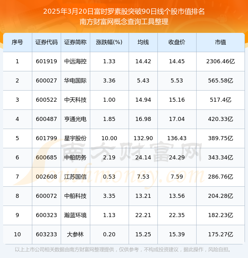 2025年3月20日富时罗素股突破90日线个股市值排名