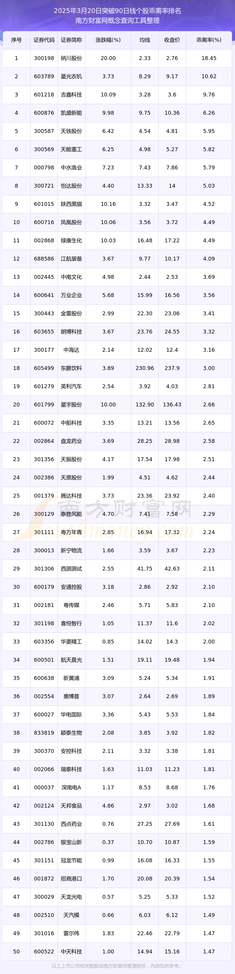 根据南方财富网概念查询工具数据统计,截止2025年3月20日收盘,共有149只个股收盘价向上突破了90日线,其中乖离率较大的个股有纳川股份、星光农机、吉鑫科技、凯盛新能、天铁股份等,乖离率分别为18.45%、10.62%、9.76%、6.26%、5.95%。