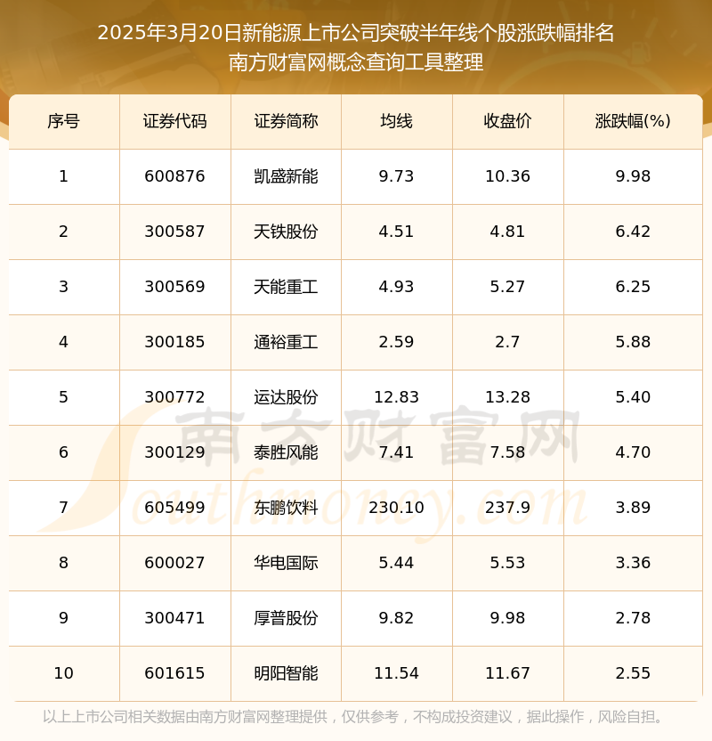 根据南方财富网概念查询工具数据统计,截止2025年3月20日收盘,新能源上市公司共有26只个股收盘价向上突破了半年线。其中涨幅较大的个股有凯盛新能、天铁股份、天能重工等,涨幅分别为9.98%、6.42%、6.25%。