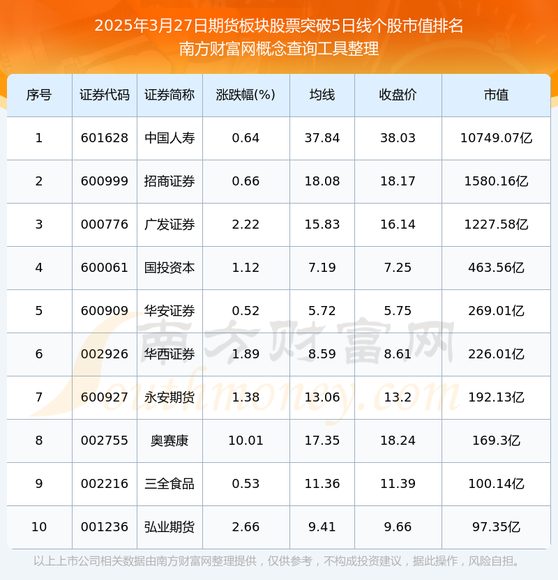 根据南方财富网概念查询工具数据统计,截止2025年3月27日收盘,期货板块股票共有13只个股收盘价向上突破了5日线。其中市值较大的个股有中国人寿、招商证券、广发证券等,市值分别为10749.07亿、1580.16亿、1227.58亿。