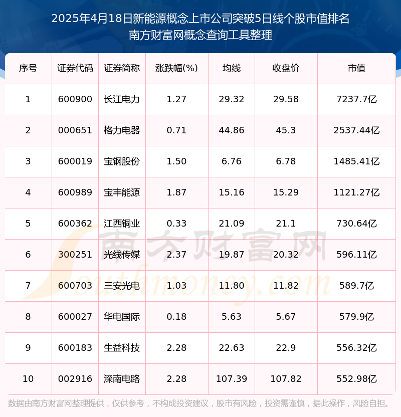 根据南方财富网概念查询工具数据统计,截止2025年4月18日收盘,新能源概念上市公司共有186只个股收盘价向上突破了5日线。其中市值较大的个股有长江电力、格力电器、宝钢股份等,市值分别为7237.7亿、2537.44亿、1485.41亿。