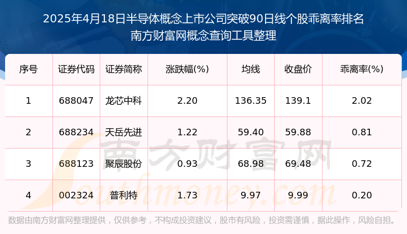 2025年4月18日半导体概念上市公司突破90日线个股乖离率排名