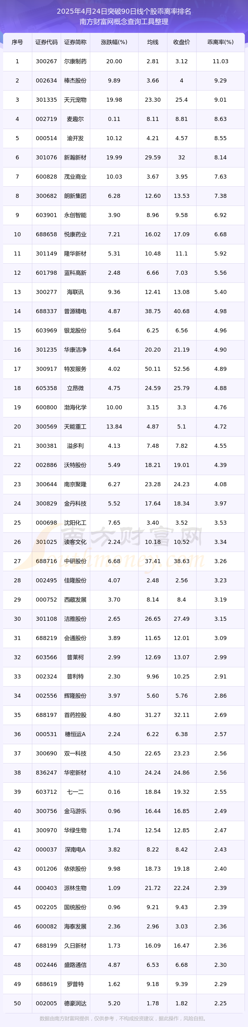 根据南方财富网概念查询工具数据统计,截止2025年4月24日收盘,共有137只个股收盘价向上突破了90日线,其中乖离率较大的个股有尔康制药、棒杰股份、天元宠物、麦趣尔、渝开发等,乖离率分别为11.03%、9.29%、9.01%、8.63%、8.55%。