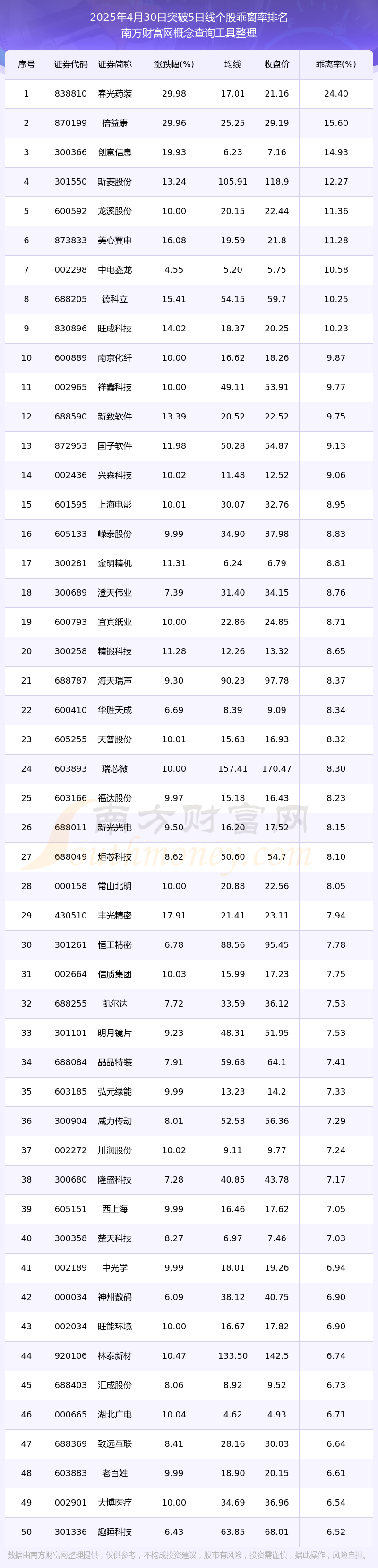 根据南方财富网概念查询工具数据统计,截止2025年4月30日收盘,共有1419只个股收盘价向上突破了5日线,其中乖离率较大的个股有春光药装、倍益康、创意信息、斯菱股份、龙溪股份等,乖离率分别为24.40%、15.60%、14.93%、12.27%、11.36%。