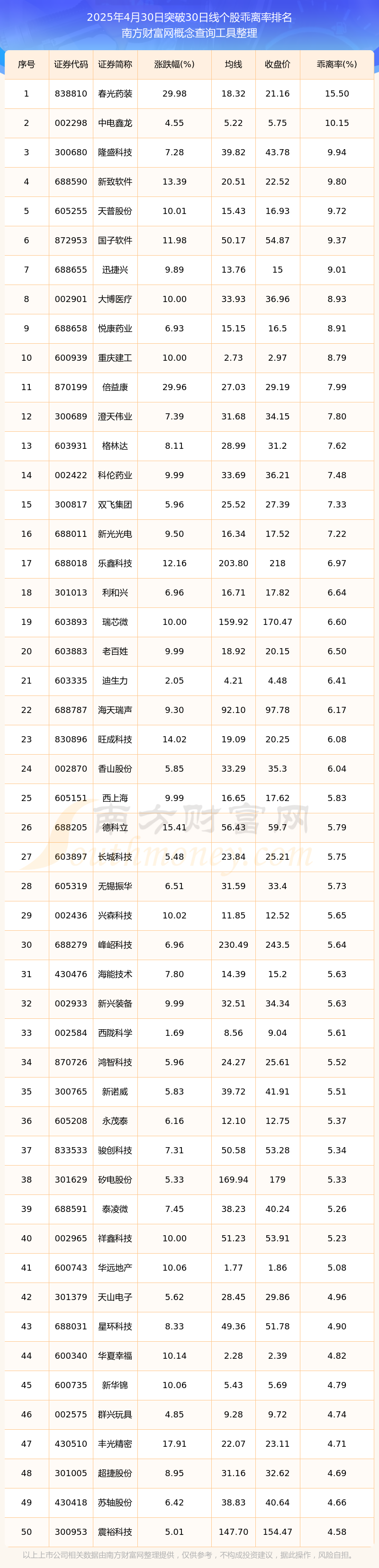 根据南方财富网概念查询工具数据统计,截止2025年4月30日收盘,共有448只个股收盘价向上突破了30日线,其中乖离率较大的个股有春光药装、中电鑫龙、隆盛科技、新致软件、天普股份等,乖离率分别为15.50%、10.15%、9.94%、9.80%、9.72%。