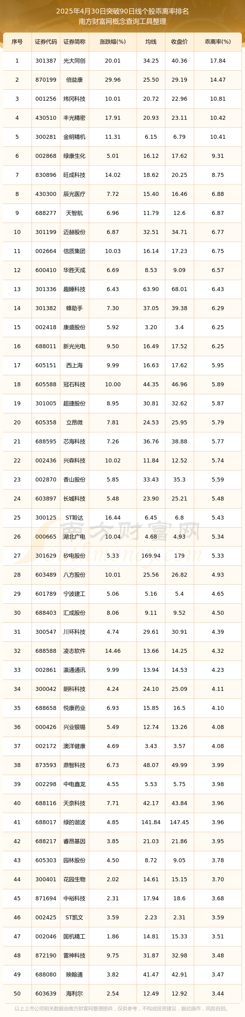 根据南方财富网概念查询工具数据统计,截止2025年4月30日收盘,共有271只个股收盘价向上突破了90日线,其中乖离率较大的个股有光大同创、倍益康、炜冈科技、丰光精密、金明精机等,乖离率分别为17.84%、14.47%、10.81%、10.42%、10.41%。 2025年4月30日突破9
