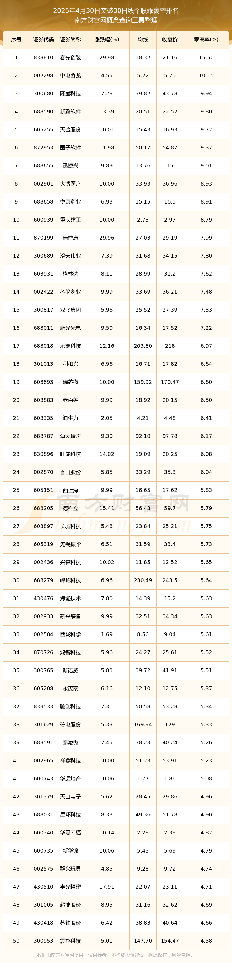 根据南方财富网概念查询工具数据统计,截止2025年4月30日收盘,共有448只个股收盘价向上突破了30日线,其中乖离率较大的个股有春光药装、中电鑫龙、隆盛科技、新致软件、天普股份等,乖离率分别为15.50%、10.15%、9.94%、9.80%、9.72%。 2025年4月30日突破30