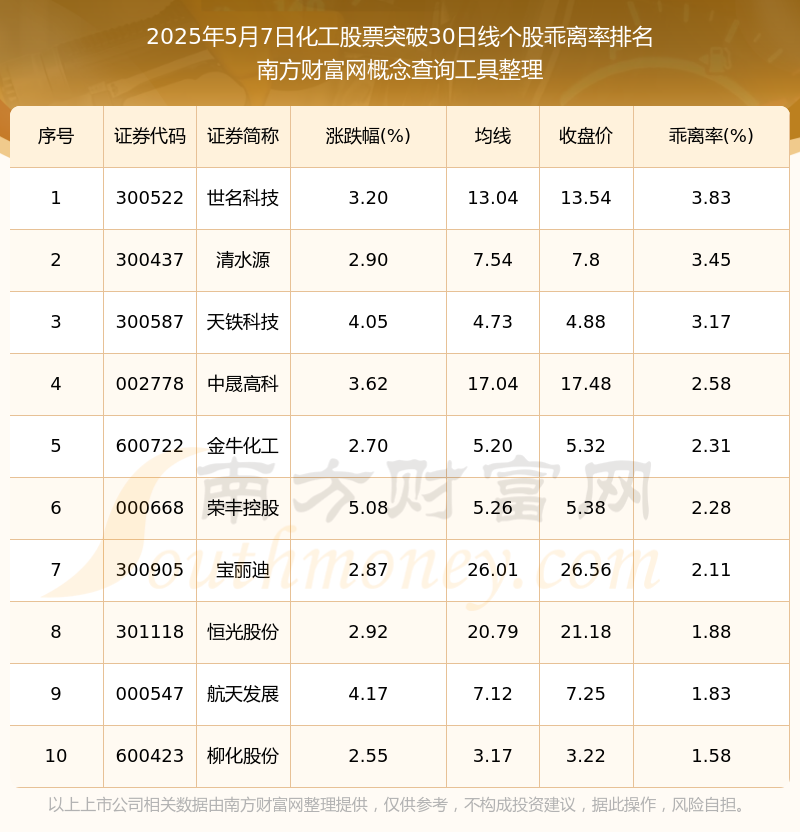 根据南方财富网概念查询工具数据统计,截止2025年5月7日收盘,化工股票共有46只个股收盘价向上突破了30日线。其中乖离率较大的个股有世名科技、清水源、天铁科技等,乖离率分别为3.83%、3.45%、3.17%。