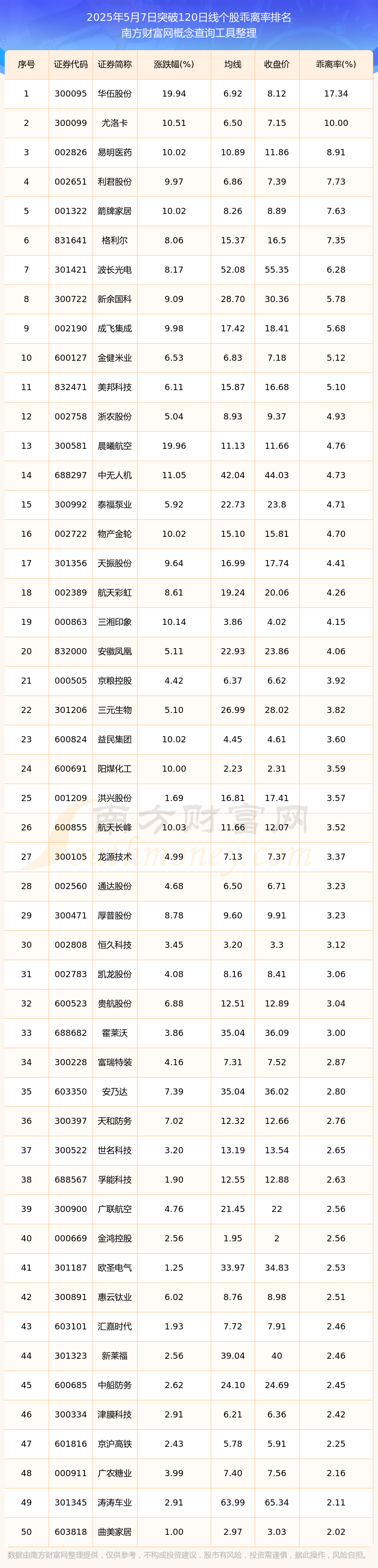 根据南方财富网概念查询工具数据统计,截止2025年5月7日收盘,共有199只个股收盘价向上突破了120日线,其中乖离率较大的个股有华伍股份、尤洛卡、易明医药、利君股份、箭牌家居等,乖离率分别为17.34%、10.00%、8.91%、7.73%、7.63%。