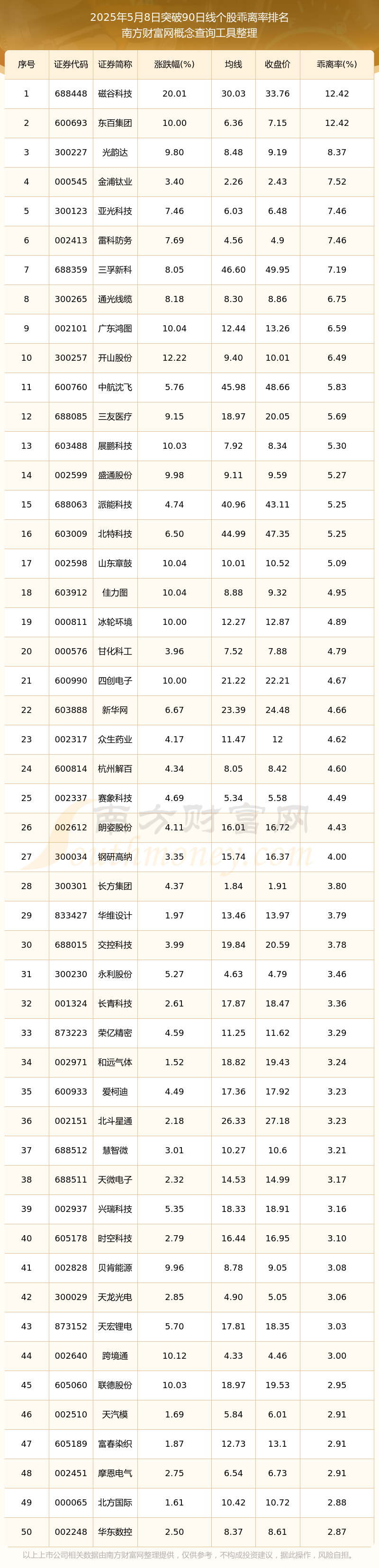 2025年5月8日突破90日线个股乖离率排名