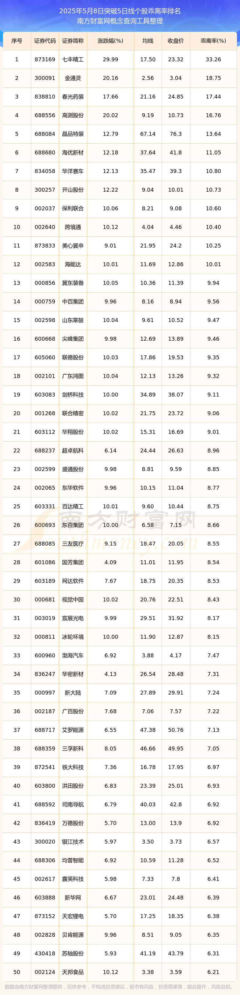 根据南方财富网概念查询工具数据统计,截止2025年5月8日收盘,共有928只个股收盘价向上突破了5日线,其中乖离率较大的个股有七丰精工、金通灵、春光药装、高测股份、晶品特装等,乖离率分别为33.26%、18.75%、17.44%、16.76%、13.64%。