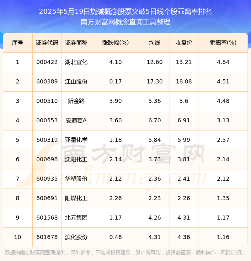 根据南方财富网概念查询工具数据统计,截止2025年5月19日收盘,烧碱概念股票共有19只个股收盘价向上突破了5日线。其中乖离率较大的个股有湖北宜化、江山股份、新金路等,乖离率分别为4.84%、4.51%、4.48%。