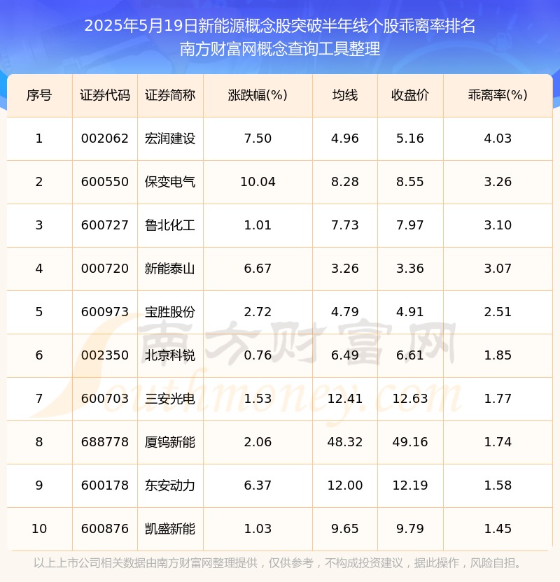 根据南方财富网概念查询工具数据统计,截止2025年5月19日收盘,新能源概念股共有27只个股收盘价向上突破了半年线。其中乖离率较大的个股有宏润建设、保变电气、鲁北化工等,乖离率分别为4.03%、3.26%、3.10%。