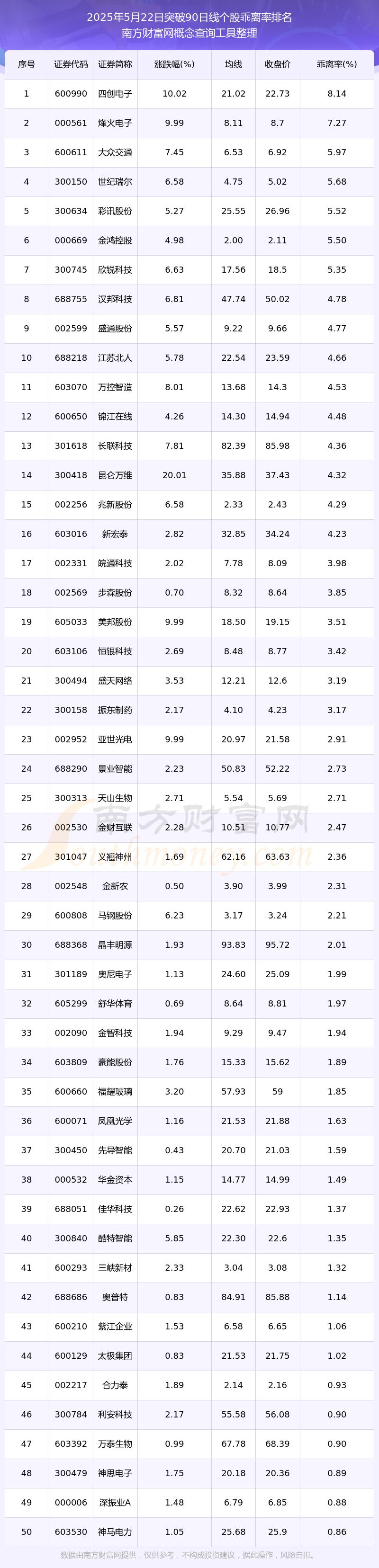 根据南方财富网概念查询工具数据统计,截止2025年5月22日收盘,共有73只个股收盘价向上突破了90日线,其中乖离率较大的个股有四创电子、烽火电子、大众交通、世纪瑞尔、彩讯股份等,乖离率分别为8.14%、7.27%、5.97%、5.68%、5.52%。